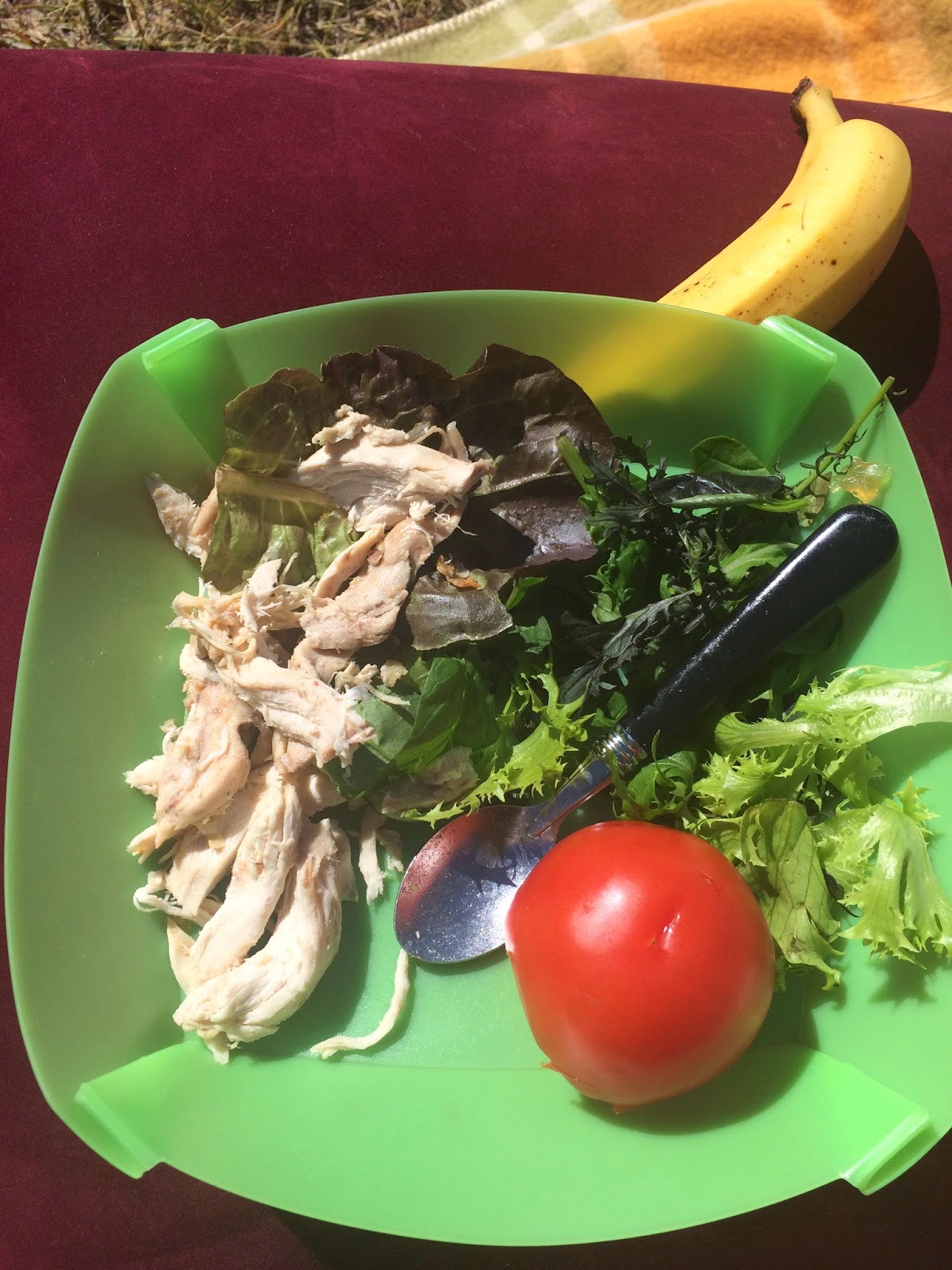 Camping- shredded chicken, dry greens and a tomato, banana for dessert. This looks boring but it was delicious. When meat is well-sourced, it just tastes better.